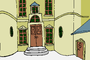 Du bist im Innenhof des Schlosses. Geradeaus gelangst Du durch das schwere Eingangstor in die Empfangshalle. Rechts führt eine kleine Tür mit Guckloch in das Wirtschaftsgebäude.