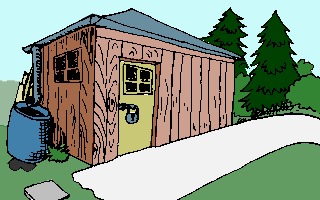 Du stehst vor der Gartenhütte. Die Türe ist verriegelt. Mit blosen Händen bekommst Du sie nicht auf. Das Schloss sieht verrostet aus.