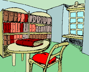 Hier steht ein Tisch und viele Regale mit Büchern. Auf dem Tisch liegt ein dickes, altes Buch.