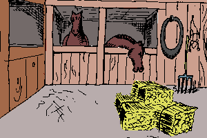 Hier sind edle Reitpferde in ihren Boxen. Vorne befinden sich große duftende Ballen aus frischem Heu. Ein Pferd bemüht sich erfolglos daran zu knabbern.
