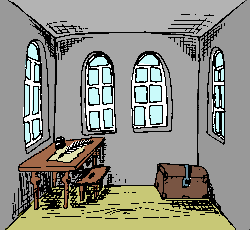 Du bist jetzt im Turm über dem Kaminzimmer. Mitten im Raum steht eine schwere Eichentruhe. Es scheint als ob Du am Ziel deiner Träume angekommen seist.
