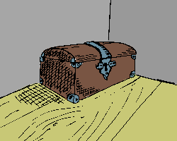Die Truhe sieht sehr stabil aus, doch an der Vorderseite befindet sich ein Schloss. Vielleicht passt der Schlüssel...
